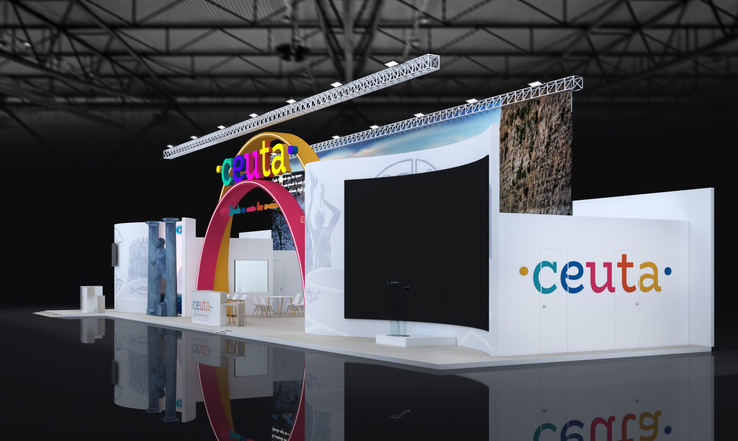 El stand de Ceuta presenta un diseño de concepto abierto, con líneas curvas y arcos de gran tamaño que evocan el lema “Ceuta, Puerta del Mediterráneo”. Como pieza central, se incluirá una réplica de la estatua de Hércules de casi cuatro metros de altura, un símbolo representativo de la ciudad.