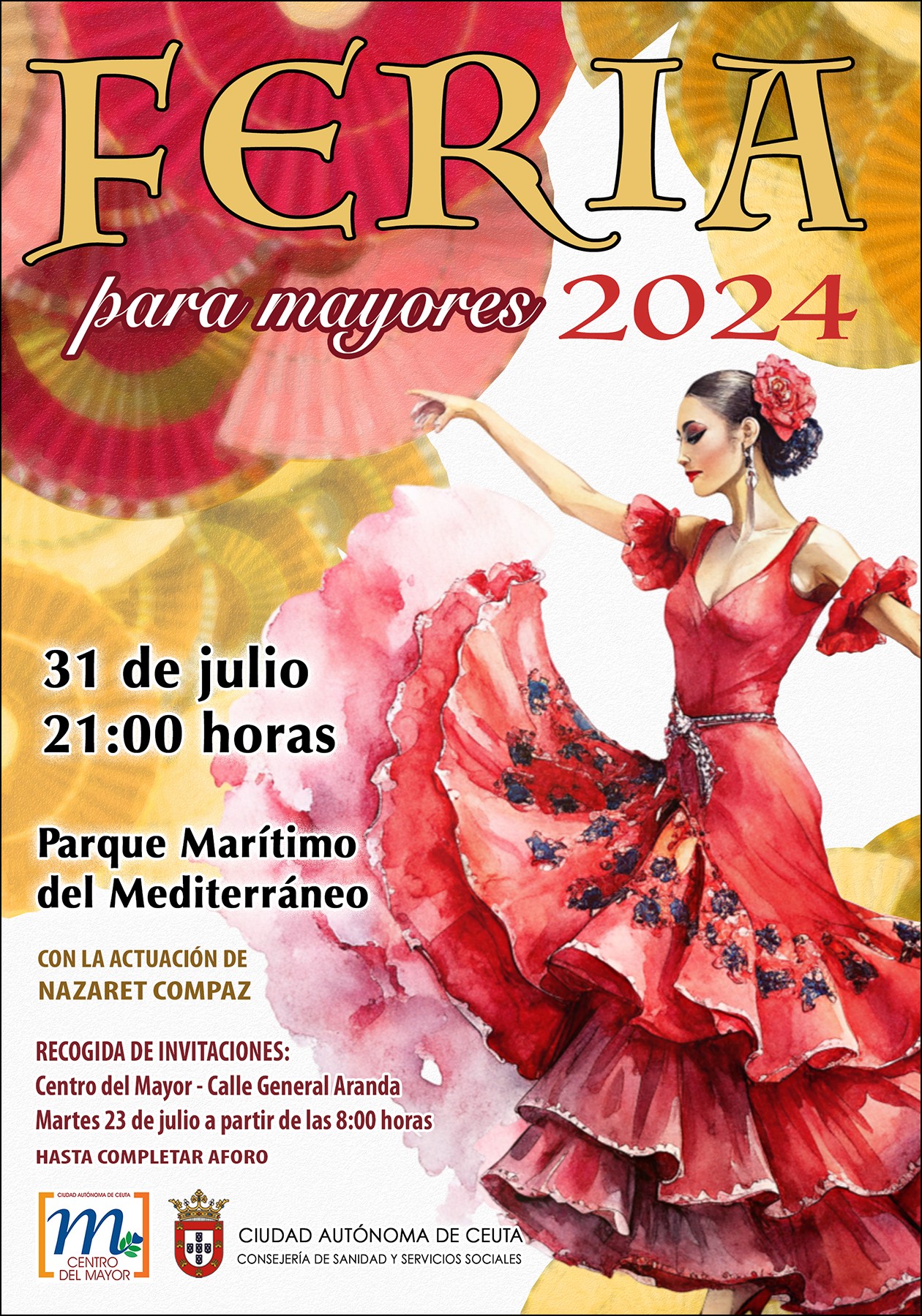 La Consejería de Sanidad y Servicios Sociales de Ceuta, a través de su Centro del Mayor, ha organizado la tradicional cena para mayores con motivo de las Fiestas Patronales. Este evento, previsto para el 31 de julio en el Parque Marítimo del Mediterráneo, contará con la participación de 700 asistentes y la actuación especial de la cantante ceutí Nazaret Compaz