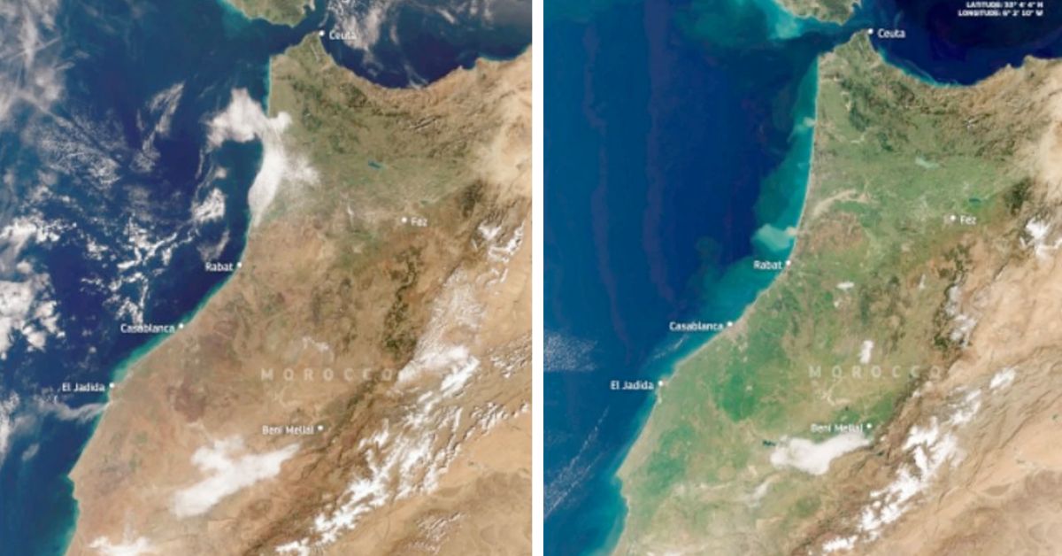 La comparación de imágenes del satélite Sentinel-3 tomada el 20 de febrero de 2025 y la misma fecha en 2026 revela claramente que el noreste de Marruecos ha pasado de colores ocres y escasa vegetación a un verde intenso que indica la recuperación de los ecosistemas y tierras agrícolas.