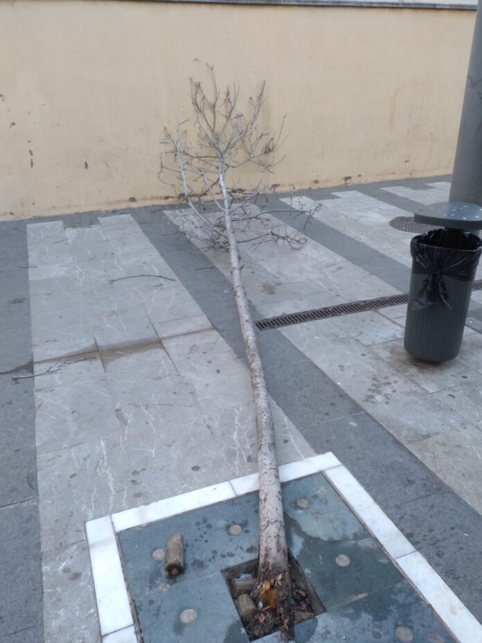 Las noches de Ceuta suelen implicar que determinados grupos de personas jóvenes la emprendan con mobiliario urbano, ornamentos florales y, en este caso, un árbol.