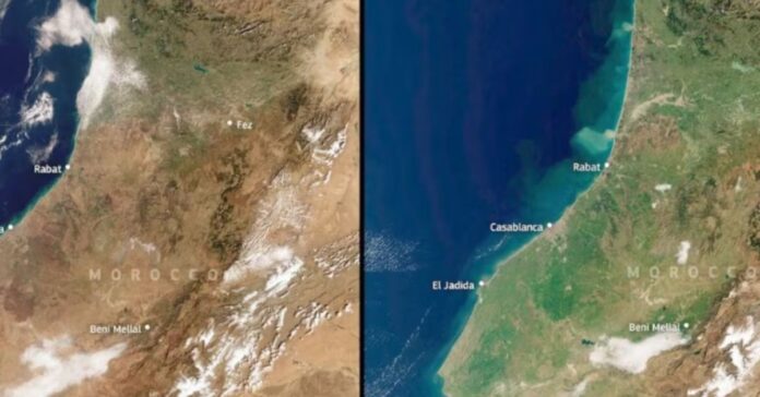 El país del norte de África recupera un verdor que no se observaba en diez años. Las intensas precipitaciones de los últimos meses han convertido terrenos áridos en extensos mantos verdes visibles desde el espacio, y los embalses superan el 70% de su capacidad.