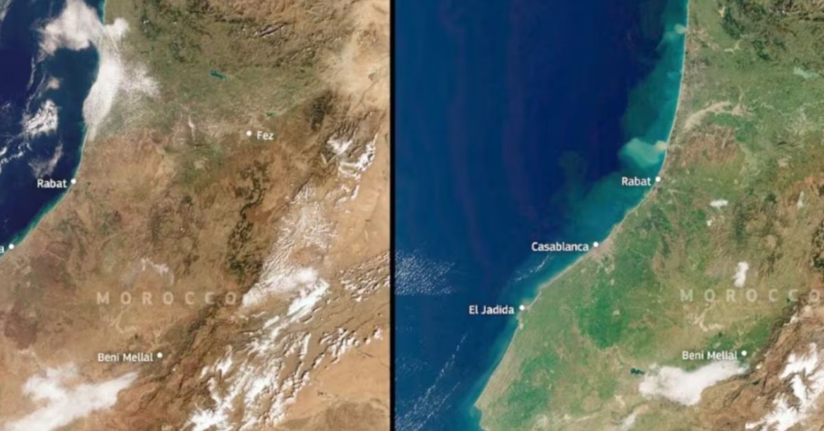 Marruecos presenta un cambio en sus tonalidades. Durante casi una década, predominaban los colores marrones y la tierra agrietada, pero en solo dos meses, esta zona ha experimentado un notable incremento en la vegetación. Imágenes tomadas por el satélite Copernicus Sentinel-3 de la Agencia Espacial Europea (ESA) evidencian una transformación contundente: la costa atlántica y la región noreste del país exhiben un verde intenso que no se había visto en más de una década.