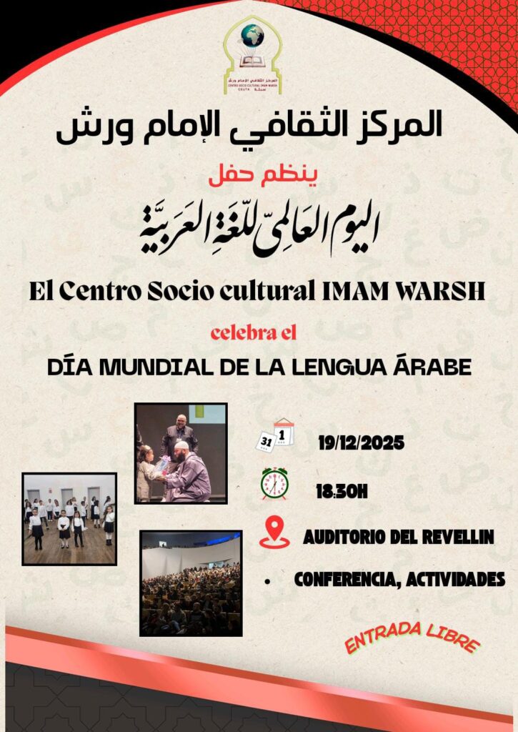 Ceuta. El Centro Sociocultural Imam Warsh celebrará mañana viernes, 19 de diciembre, el Día Internacional de la Lengua Árabe con un acto cultural y conmemorativo que tendrá lugar en el Auditorio del Revellín a partir de las 18.30 horas. La iniciativa pretende destacar la riqueza, la belleza y la relevancia histórica y cultural de la lengua árabe, así como su papel en la educación y la convivencia.
