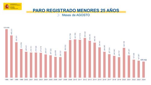 El desempleo entre los jóvenes menores de 25 años también registró un aumento en agosto, con 2.186 desempleados más (1,25%) respecto al mes anterior, situándose en un total de 177.112. No obstante, este grupo ha acumulado 40 meses consecutivos de caídas interanuales.