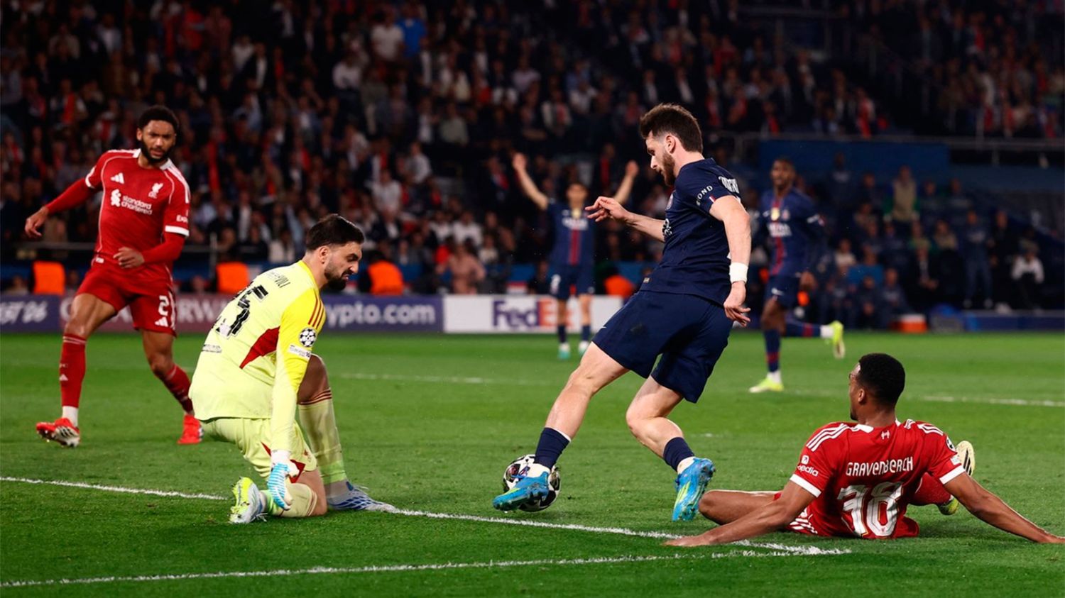 Incidencias: Partido de vuelta de cuartos de final de la Champions League. El árbitro Maurizio Mariani amonestó a Mac Allister y Konaté por el lado local. El PSG registró las bajas por lesión de Nuno Mendes y Désiré Doué durante el encuentro.