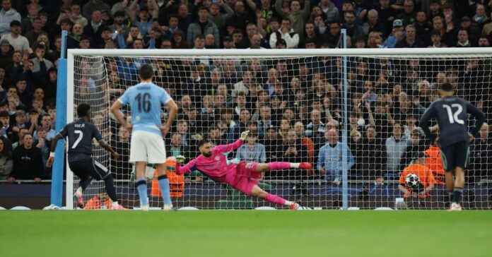 El desarrollo del partido cambió radicalmente antes de terminar la primera mitad. Tras varias intervenciones notables de Courtois ante Cherki y Rodri que mantuvieron el equilibrio, llegó una acción determinante: Vinicius Jr. avanzó con velocidad, disparó al poste y, en el rebote, Bernardo Silva despejó el balón con la mano sobre la línea de gol.