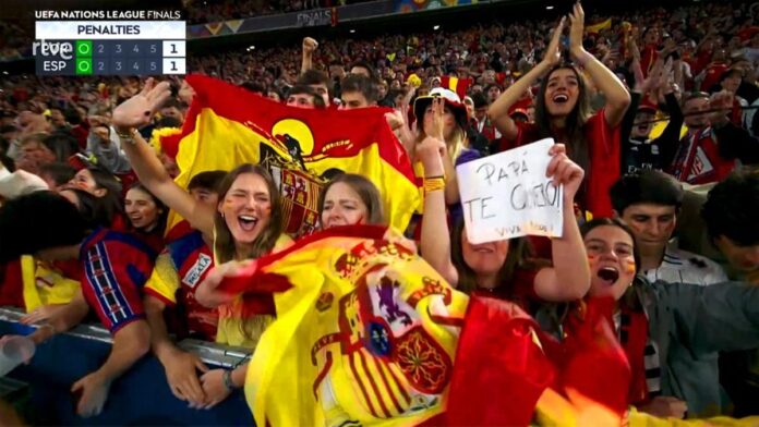 En la emisión de la final de la Nations League en Múnich, se destacó la presencia de un aficionado español que mostró de forma reiterada una bandera preconstitucional con el Águila de San Juan y la inscripción «Una grande libre», un emblema vinculado al franquismo.