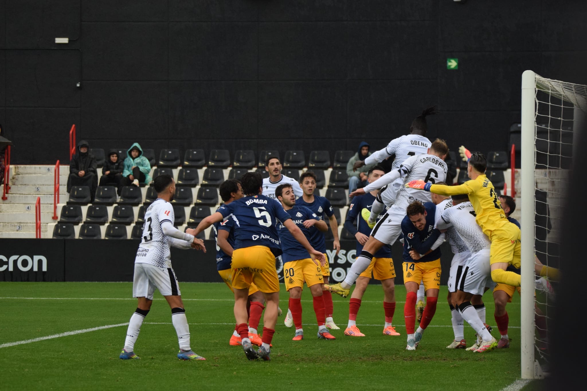 La primera ocasión clara fue para los locales. Yann Bodiger ejecutó una falta lejana con potencia y colocación, estrellando el balón en el larguero y rozando un gol que habría cambiado el guion del partido. La respuesta del Andorra llegó con un disparo raso de Justin García que obligó a Vallejo a intervenir con seguridad sobre el césped mojado.