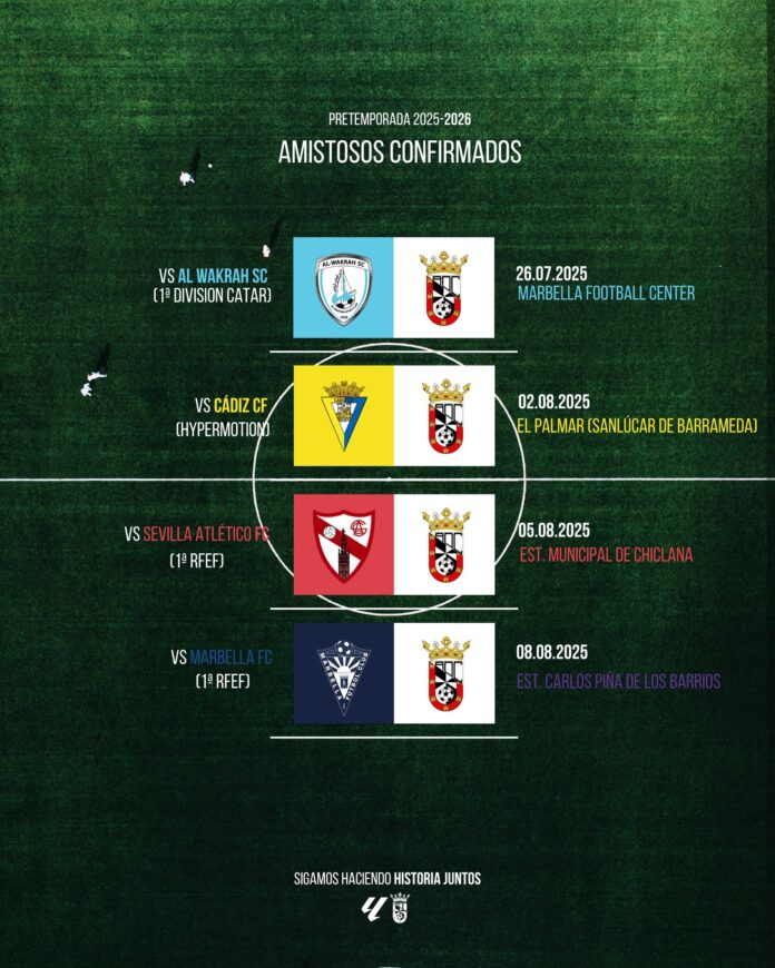 La pretemporada finalizará el 8 de agosto con un duelo contra el Marbella FC en el Estadio Carlos Piña de Los Barrios, programado para las 20:00 horas. Este será el último encuentro preparatorio antes del debut oficial en Segunda División.