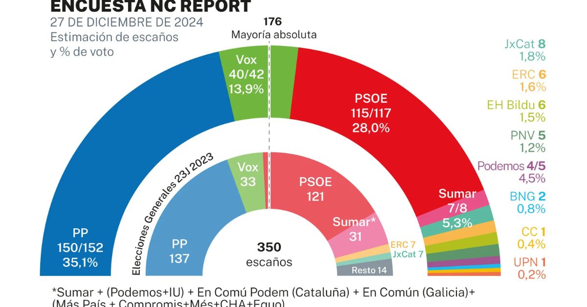 Con el cierre de 2024, las tendencias políticas parecen consolidarse. Según la última encuesta de NC Report para LA RAZÓN, el Partido Popular (PP) no solo mantendría su posición como la fuerza más votada, sino que Alberto Núñez Feijóo podría formar un gobierno sólido gracias a una mayoría absoluta junto a Vox. Por su parte, el Partido Socialista Obrero Español (PSOE), liderado por Pedro Sánchez, experimentaría un retroceso moderado que, aunque no alcanzaría niveles catastróficos, lo debilitaría considerablemente frente al auge del PP y su socio potencial.