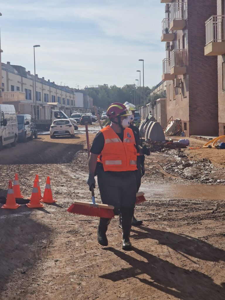 Un grupo de voluntarios de la asociación se encuentra actualmente trabajando en la localidad de Alfafar, una de las más afectadas por el temporal, llevando a cabo tareas de limpieza y ayuda humanitaria para apoyar a los damnificados. Su labor incluye la retirada de escombros y barro, la limpieza de viviendas y espacios públicos, así como la distribución de suministros básicos a las personas que se han visto afectadas por las inundaciones.