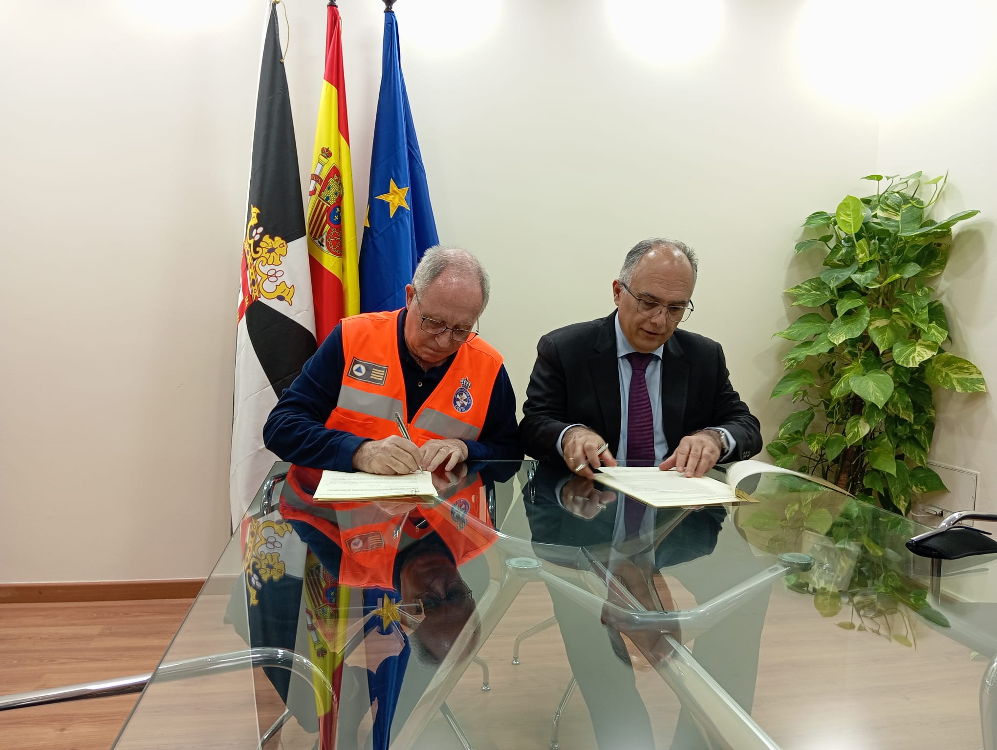 El consejero de Presidencia y Gobernación, Alberto Gaitán, y el presidente de la Asociación de Voluntarios de Protección Civil, Juan Moreno, han firmado hoy la renovación del convenio de colaboración mediante el cual la Ciudad Autónoma de Ceuta destina 40.000 euros para apoyar la labor que desarrolla esta entidad en beneficio de la ciudadanía.