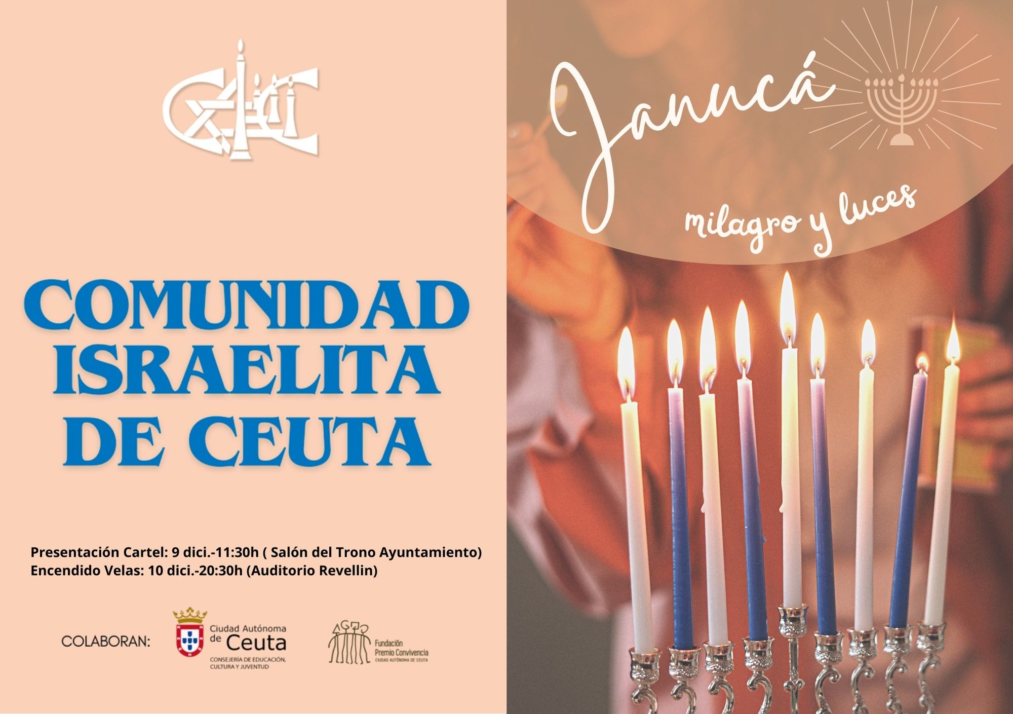 La Comunidad Israelita de Ceuta llevará a cabo la ceremonia de encendido de las velas de Janucá el próximo domingo, 10 de diciembre, a las 20:30 horas en el Auditorio del Revellín.