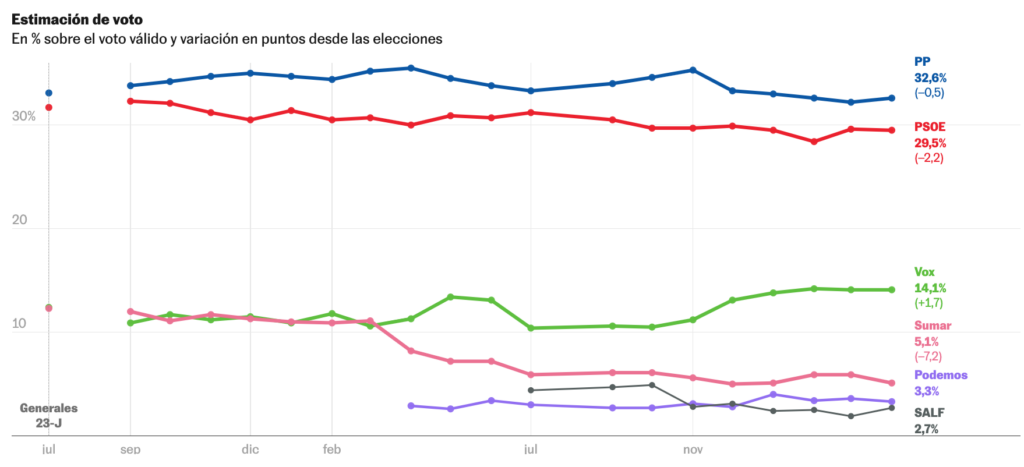 Por bloques, la suma de PP y Vox supera en casi nueve puntos al bloque de izquierda liderado por el PSOE. Los partidos que actualmente sostienen el Ejecutivo (Junts, ERC, EH Bildu, PNV, BNG y CC) se mantienen estables con un 6,7% conjunto.