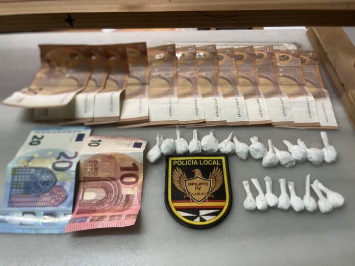 Ante estos hechos, se procedió a la identificación y cacheo superficial del conductor del vehículo al que se le incautaron 22 papelinas de sustancia estupefaciente que a expensas de confirmación por el laboratorio, resultaría ser cocaína, así como una cantidad importante de dinero en metálico y dos teléfonos móviles. Fue trasladado a la comisaría del Cuerpo Nacional de Policía para llevar a cabo las diligencias pertinentes. Durante el proceso, se realizó el pesaje de la sustancia incautada, que arrojo unos 20 gramos aproximadamente.