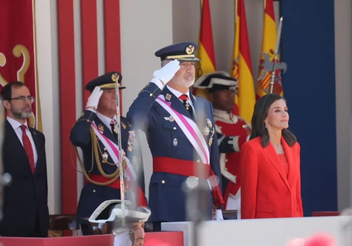 Escoltados por la Unidad de Caballería de la Guardia Real, los Reyes han llegado en coche a la avenida de los Hermanos Menéndez Pidal, por donde transcurre la mayor parte del desfile, y han escuchado el himno nacional acompañado de una salva de 21 cañonazos.