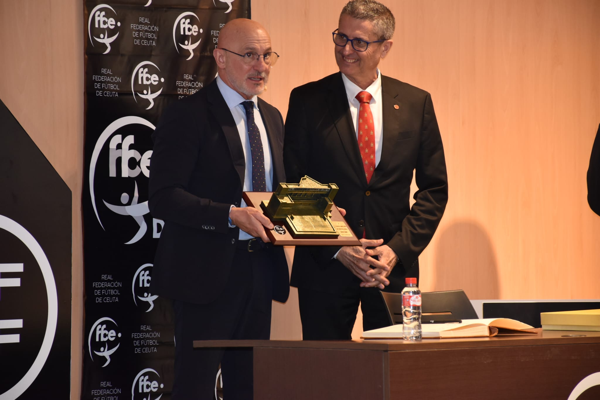 Tras pasar por el Palacio de la Asamblea y la Iglesia de Santa María de África, De la Fuente visitó la sede de la Real Federación de Fútbol de Ceuta (RFFCE), acompañado por su presidente, Antonio García Gaona. Allí, el técnico nacional recorrió las instalaciones y posteriormente ofreció una rueda de prensa en el salón de actos, donde atendió a los medios con un tono amable y distendido.
