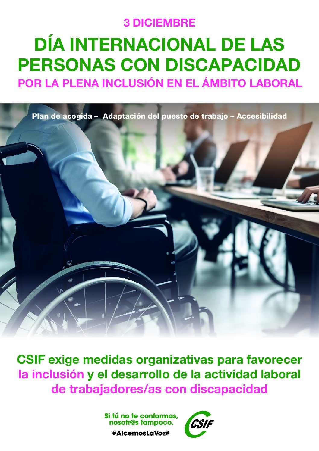 La Central Sindical Independiente y de Funcionarios (CSIF), sindicato más representativo en las administraciones públicas y con presencia creciente en el sector privado, conmemora el Día Internacional de las personas con discapacidad, 3 de diciembre, bajo el lema «CSIF por la plena inclusión en el ámbito laboral”.