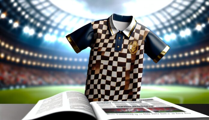 El diseño de la camiseta presenta un patrón a cuadros que evoca la nostalgia de épocas pasadas, mientras que los detalles en color dorado añaden un toque de elegancia y sofisticación. Estos elementos dorados se encuentran tanto en el escudo del club como en los logotipos de los patrocinadores, creando una armonía visual que resalta la identidad del equipo.