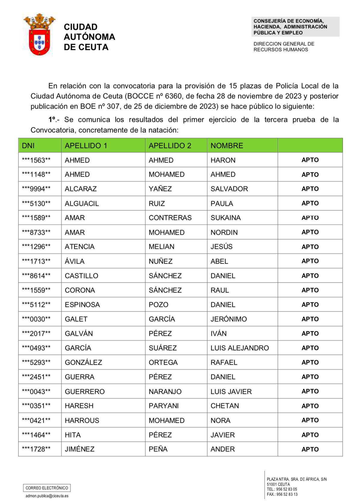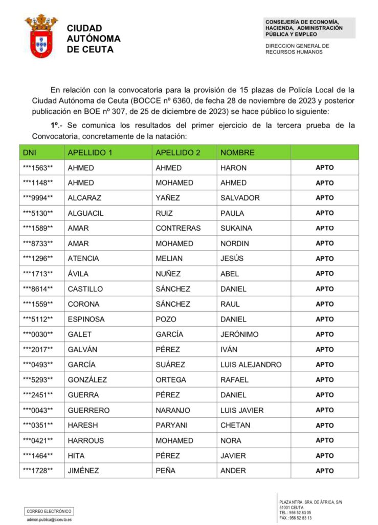 Ceuta, 6 de febrero de 2025 – La Ciudad Autónoma de Ceuta ha publicado los resultados del primer ejercicio de la tercera prueba de la convocatoria para la provisión de 15 plazas en el Cuerpo de Policía Local, correspondiente a la prueba de natación.