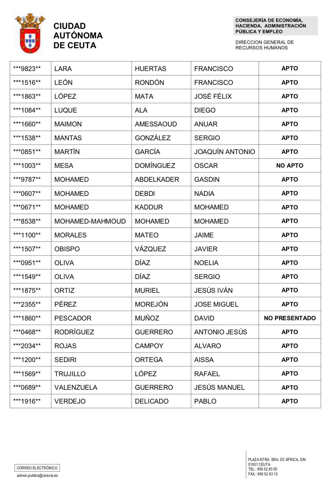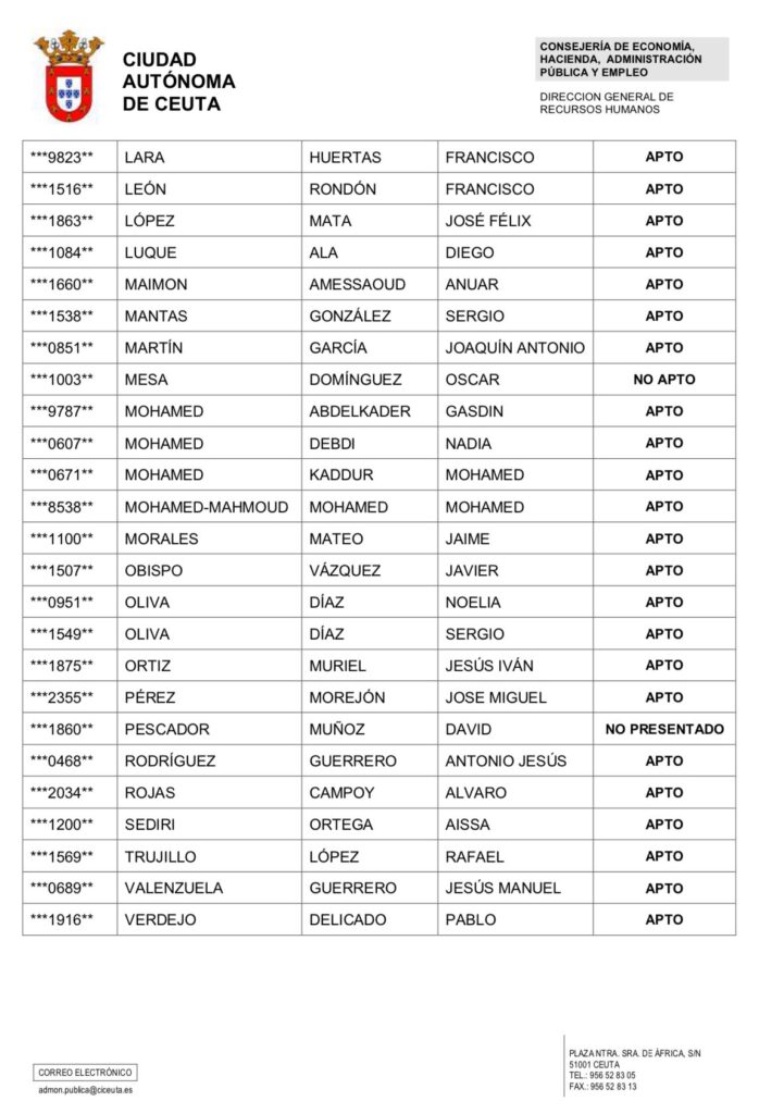 Según la información oficial publicada en el tablón de anuncios, de los aspirantes presentados, solo uno no ha superado la prueba, mientras que otro ha sido declarado “no presentado”. El resto de los participantes han obtenido la calificación de “APTO”, lo que les permite continuar con el proceso de selección.