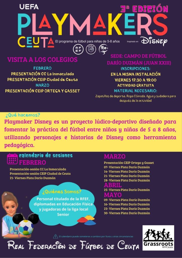 El departamento de Grassroots de la Real Federación de Fútbol de Ceuta (RFFCE) está ultimando los detalles para la tercera edición de UEFA Playmakers, un innovador programa impulsado por la UEFA y la Real Federación Española de Fútbol (RFEF) que busca fomentar la participación de las niñas en el fútbol.
